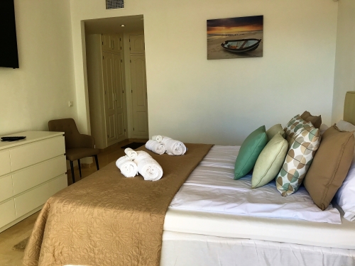 Al final del pasillo se encuentra el amplio dormitorio principal con su propio baño completo en suite y vestidor. Además de una gran cama doble (180X200cm), este dormitorio ofrece un segundo televisor LED de 60" con televisión por cable (también BBC e ITV). Este dormitorio ofrece un frente de ventana grande con acceso a la terraza en frente de él.