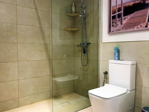 Un pasillo de la sala de estar conduce a los dos dormitorios. El dormitorio de invitados ofrece bonitas vistas a la piscina y al mar y está amueblado con 2 camas individuales, armario empotrado y escritorio. Este dormitorio tiene su propio cuarto de baño moderno en el pasillo/justo enfrente. En este baño se encuentra la lavadora y la secadora.